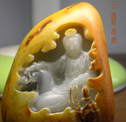此款新疆和田籽玉作品,玉料细腻、色泽脂白,且深具特色。玉料表面挂满金黄的洒金皮色,且沁有一定深度。玉石表壳带有一层薄薄的石僵,打开后里面的玉石细腻光泽。以玉石而言,和田玉的内敛以及她所代表的沧桑年月在此表露无遗